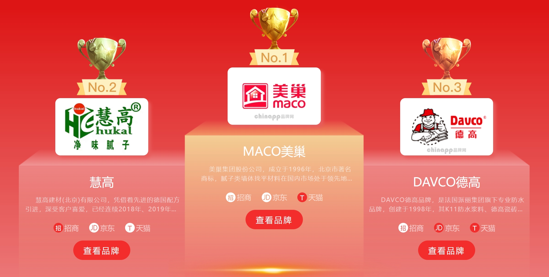 市場上排名比較靠前的膩子粉品牌有MACO美巢、DAVCO德高、慧高、JAJANA家家安和Nippon立邦等。這些品牌當中像DAVCO德高、Nippon立邦等都是耳熟能詳的涂料品牌,所以當用戶陷入選擇迷茫的時候,這兩個牌子將會成為他們的首選項。因此,我們需要分析他們的優勢所在。